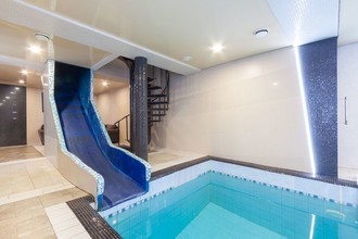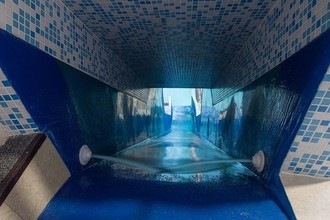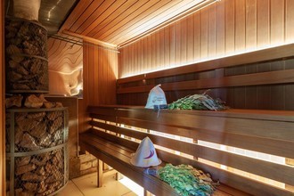 Отапливается сауна по русской традиции дровами. Внутри есть удобные деревянные скамьи, на которым легко помещается большая компания. А чтобы укрепить иммунитет на долгие уральские зимы, обязательно примите контрастный душ. Рядом с сауной имеется душевая зона с обливным ведром и небольшой бассейн, украшенный симпатичной фреской.